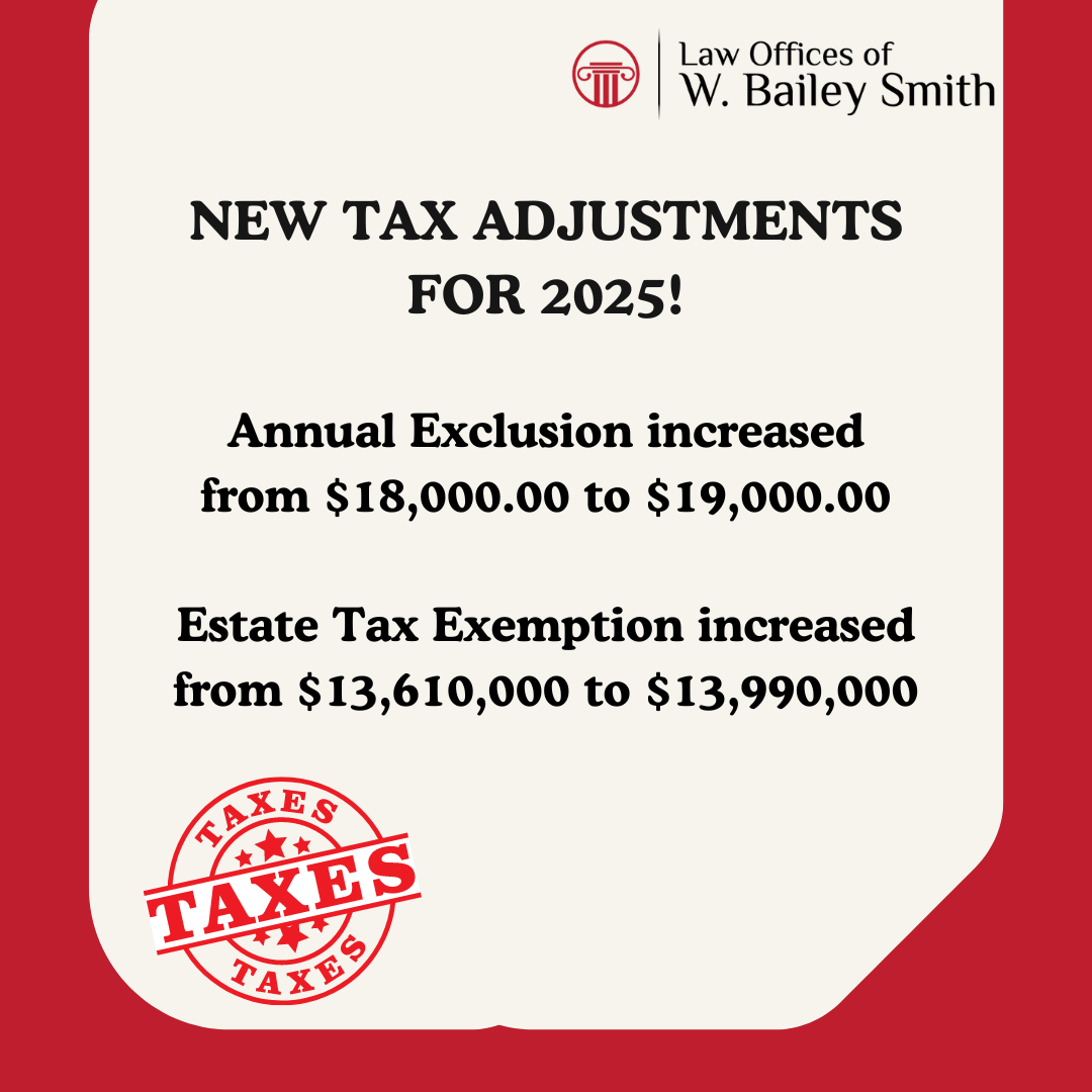 NEW TAX ADJUSTMENTS FOR 2025! 01 Oct 2024W. Bailey Smith0Blog Annual Exclusion increased from $18,000.00 to $19,000.00 Estate Tax Exemption increased from $13,610,000 to $13,990,000