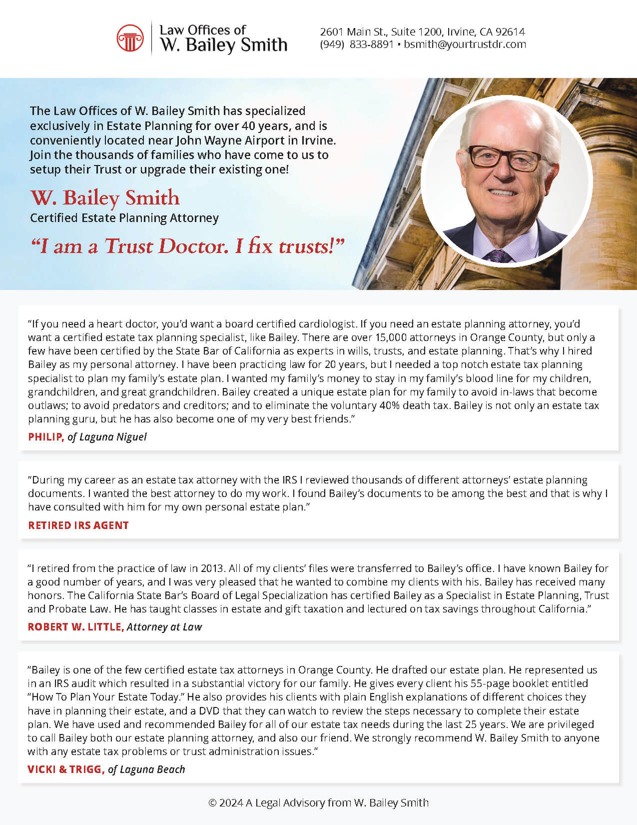 You, your family, and friends are cordially invited to a free educational seminar on “Changing of the Guard – what steps need to be taken when the trustee can no longer serve?” For your convenience we will be giving 2 presentations on Saturday, March 30 at either 9:30am or 1:30pm.